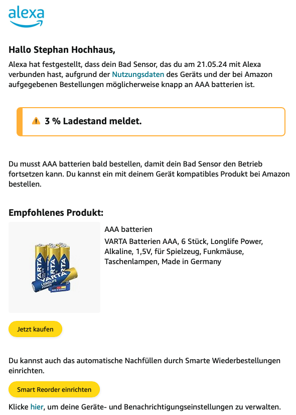 Im Badezimmer hängt ein smarter Bewegungsmelder und wenn ich mitten in der Nacht ins Bad gehe, schaltet er brav gedimmtes Licht ein, damit meine schlafwandelnden Augen nicht übermäßig geblendet werden. Durch das verhängnisvolle "Alexa, erkenne meine Geräte" irgendwann (genau genommen am 21. Mai 2024 - wie mich Amazon freundlich erinnert) ist jetzt also auch Amazon bekannt, wann sich bei mir im Badezimmer etwas tut.